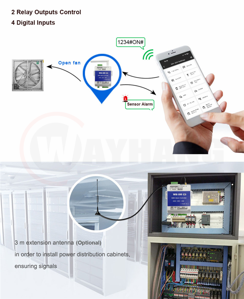 5. 2 relay outputs are for connecting the switch o f the door or machines. Relay 1 can be as gate opener or Timer. Relay 2 can linkage 4 inputs also can be as gate opener to use. but only control by sms.